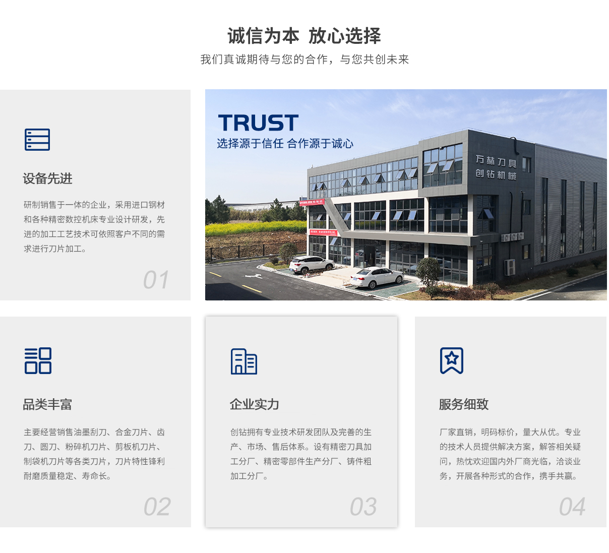 馬鞍山創(chuàng)鉆機(jī)械科技有限公司 INTRODUCTION 馬鞍山市創(chuàng)鉆機(jī)械科技有限公司(創(chuàng)鉆機(jī)械)坐落于鋼鐵之城-安徽馬鞍山,公司擁有專(zhuān)業(yè)的技術(shù)研發(fā)團(tuán)隊(duì)及完善的生產(chǎn)、市場(chǎng)、售后體系。公司設(shè)有精密刀具加工分廠(chǎng)、精密零部件生產(chǎn)分廠(chǎng)、鑄件粗加工分廠(chǎng),...